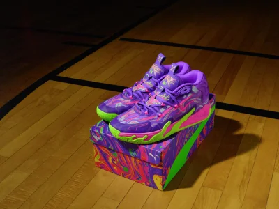 The MB.03 was designed in collaboration with LaMelo Ball, who was heavily involved in the design process, taking inspiration from his life. The MB.03 Toxic colorway is inspired by Ball's belief that he's from another world, featuring psychedelic colors of the underground and graphics reminiscent of Ball’s own alien tattoos. Designs lean into Ball’s special abilities that make him out of this world both on and off the court.