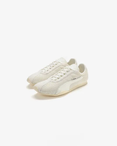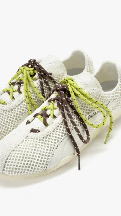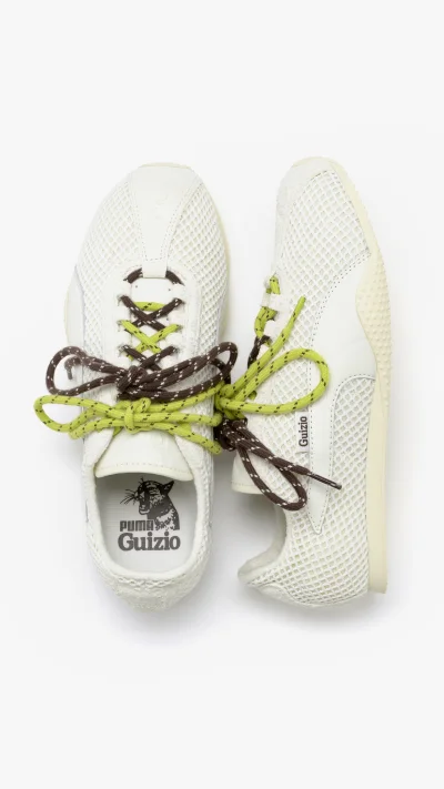 At its core is the PUMA H-Street, a retro running silhouette originally derived from the early 2000s PUMA Harambee spike. Guizio’s take strips it back with an understated palette and a tactile mix of airy mesh and fuzzy suede in light beige. Two additional lace sets in brown and neon green invite wearers to accessorize the sneakers and customize their look, while a discreet Guizio tag marks the collaboration.